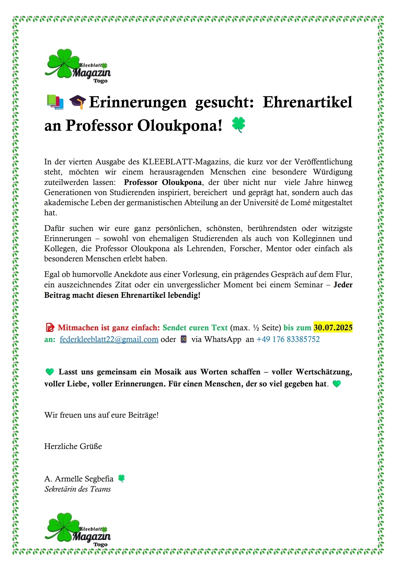In der vierten Ausgabe des KLEEBLATT-Magazins, die kurz vor der Veröffentlichung steht, möchten wir einem herausragenden Menschen eine besondere WĂŒrdigung zuteilwerden lassen: Professor Oloukpona, der ĂŒber nicht nur viele Jahre hinweg Generationen von Studierenden inspiriert, bereichert und geprĂ€gt hat, sondern auch das akademische Leben der germanistischen Abteilung an der universitĂ© de LomĂ© mitgestaltet hat.